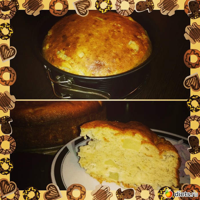 Прим. Яблоки я резала кубиками и вмешала в тесто. Форма у меня не большая была,18 см (она же и в следующем рецепте). Держала я ее дольше, чем в оригинале рецепта, примерно минут 35-40, смотрите по вашим духовкам и проверяйте спичкой.