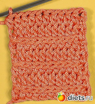 На рис. показан образец вязания, когда петли провязываются из основания петель предыдущего ряда.