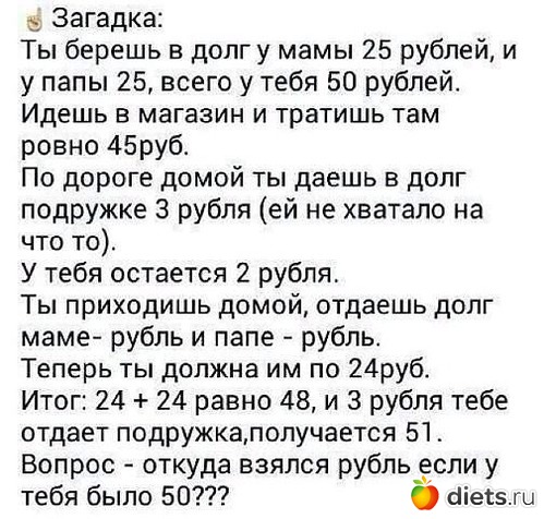В итоге долг родителям 48 рублей= (50-2)= (45 потратила+3 отдала в долг)
