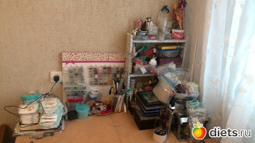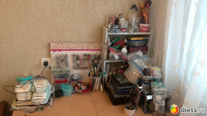 Спорт мой был уборка по квартире. Не то что генеральная, но вчера я делала то, до чего руки не доходят- тут отмыть, там протереть, тут ребенок изрисовал стену, отчистить, вещи постиранные убрать и т.д. так и пробегала... Самое главное было навести порядок на рабочем столе. Это просто ППЦ обычно. Т.к. предметов и предметиков на нем просто тысячи, для нескольких видов творчества, и всё это в процессе работы перемешивается, рассыпается, перекладывается.. еще и дети изредка приходят "помочь"..