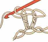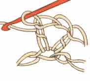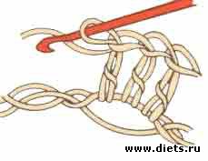 Рогатка из 2 столбиков с накидом. Сначала провязывают 1-й столбик с накидом, а затем 2-й в ту же петлю основания. Рогатки можно выполнять также из 2 столбиков без накида.