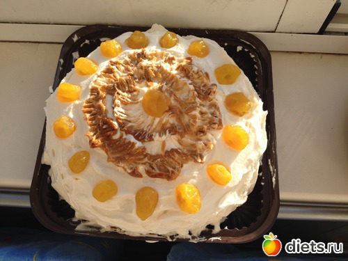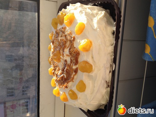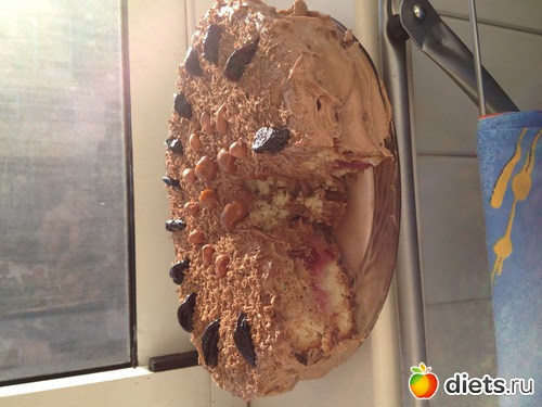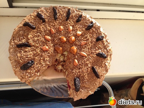 Второй обычный бисквит, прослоен вишней, пропитка вишневый сок с сахаром. Крем масло+сгущенка вареная+корица)