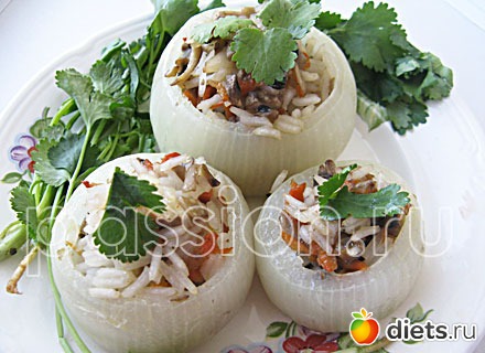 С остывшей луковицы срезать верхушку, разобрать луковицу на «чашечки», начинить смесью риса и грибов.