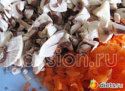 Грибы мелко нарезать, морковь измельчить с помощью терки.