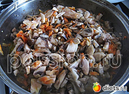 Обжарить грибы и морковь на растительном масле, добавить рис, специи, все перемешать.