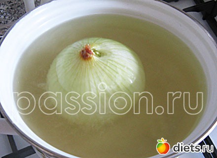 Луковицу очистить, отварить в течение 20 минут, дать остыть. Рис отварить в подсоленной воде.