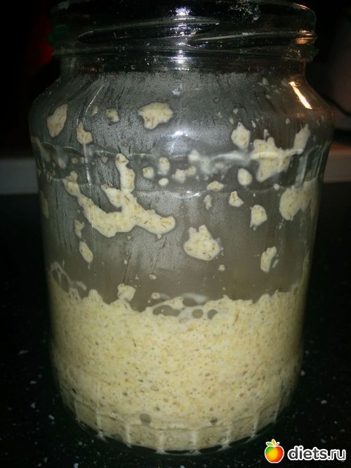 20.00. Опять полная банка. Выбросила грамм 80, подкормила 50 мл воды, 35 г ржаной муки. Стал появляться кислый запах. Оставила у окна.