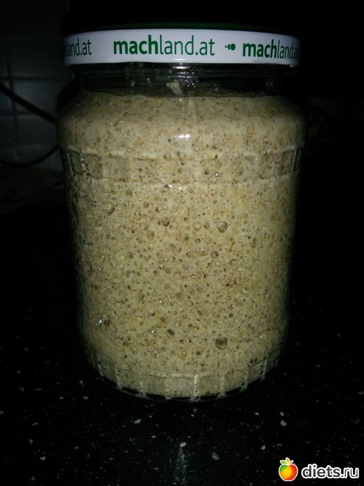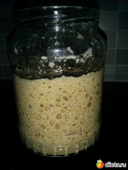 19.30(через 7 часов после подкормки). Закваска увеличилась в 3 раза. Заняла всю банку. Процесс брожения идет очень активно. Я испугалась, что продолжит расти и обмяла ее, просто помешав ложкой, чтобы убрать часть пузырькой и уменьшился объем. Оставила недалеко у окна, в прохладе. Как оказалось потом, это было моей ошибкой, потому что после этого процесс приостановился, а для незрелой закваски это не очень полезно.