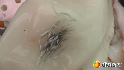 Трубочки эти наполнены двухфракционным субстратом – полупрозрачной жидкостью и более густой, консистенции сильно жидкой сметаны. Это, пардон, как и у всего прогрессивного человечества мужского полу – семенная жидкость и собственно сперматозоиды. Эти капсулы сохраняют жизнеспособность и некоторую подвижность даже в наземных условиях, а не в воде, в течение довольно длительного времени, после того, как сам кальмар уже помер. Во всяком случае несколько часов при температуре 10-15 гр. плюса, без какого-нибудь замораживания их не убивает. Они могут проползти некоторое не очень большое расстояние – несколько сантиметров и изгибаться. Это уже когда кальмар потерял свою природную окраску и становится пятнистым – бело-бордовым, шкура облазит, а тушка уже в стадии посмертного окоченения. При осторожном дотрагивании каким-нибудь предметом до одного из концов капсулы, с другого конца выстреливается сперма на 3-5-7 см. Как влияет на них замораживание – не знаю. Но вполне возможно, что не убивает, а наоборот сохраняет. Ведь недаром донорскую сперму в жизнеспособном состоянии сохраняют очень долго при очень низких температурах. Во время нереста кальмар выдавливает из себя через сифон сперматофоры, которые пробивают или даже прогрызают пленку самки между клювом и мантией. Попав внутрь тела кальмара они находят стыки с неоплодотворенными яйцами, прогрызают пленку стыков и выстреливают сперму. Через некотрое время маленькие прозрачненькие кальмарчики-детки с большими черными глазами выходят наружу, через сифон самки..." Может, этот кальмар - несостоявщийся отец?