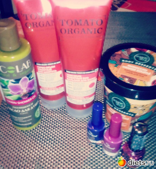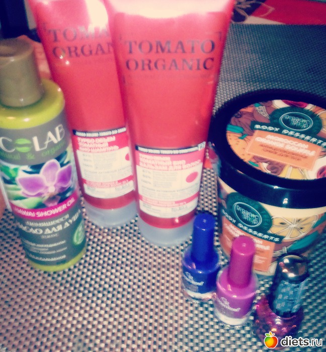 Ещё купила какой-то томатный шампунь и бальзам, купилась на упаковку, классно она выглядит, ну и ещё на обещание мега обьема, на отсутствие слс и парабенов, и на то что он помидорковый) был ещё морковный, но не помню для чего)
