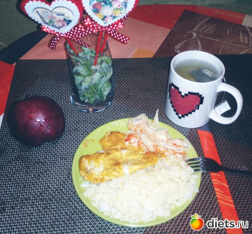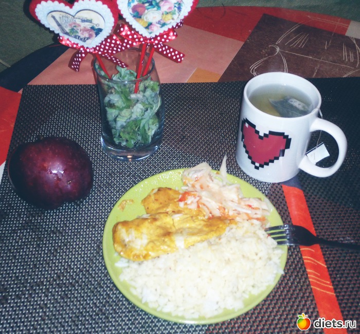 Обед: рис нешлифованный отварной;курогрудь, в йогурте и чили, запеченная; салат из капусты и болгарского перца с луком; яблоко; зелёный чай.
