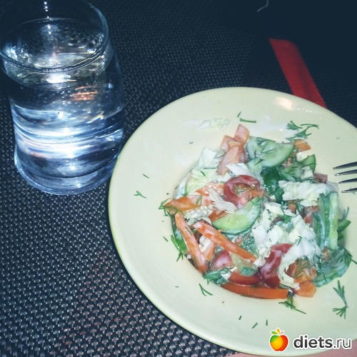 Ужин: Салат из перца, пекинки, огурца, черри и укропа, заправленный йогуртом. Минералка.