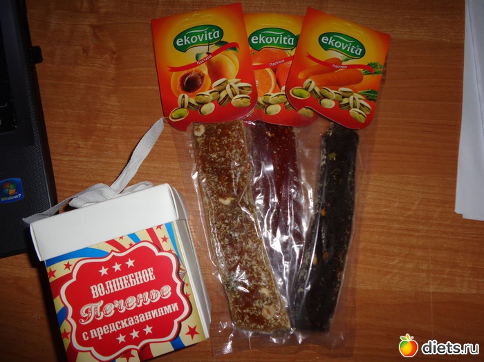 В магазине я нашла для себя альтернативу любимым вредностям- пастилу Ekovita трёх видов:морковную, апельсиновую и абрикосовую, а также " Вкусную помощь" - печеньки с предсказаниями, ну и пару ароматических свечек для душевного успокоения)