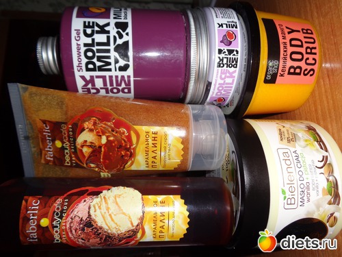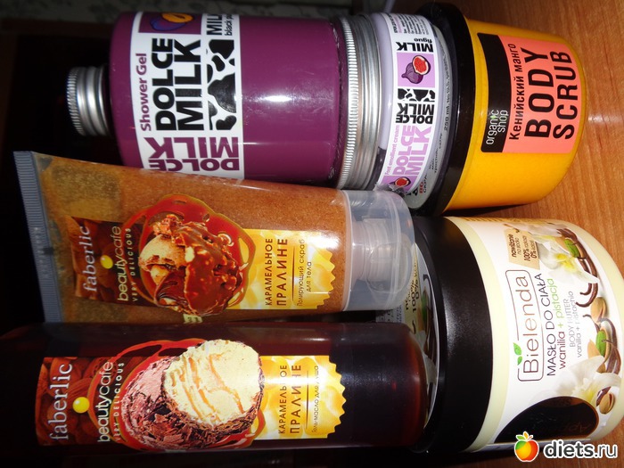Faberlic Карамельное пралине-гель для душа и скраб( запах божественный), Dolce Milk- сливовый гель для душа и крем для ножек-молоко и инжир, Organic shop - скраб для тела кенийский манго, и масло для тела ваниль и фисташка Bielenda. Баночки/скляночки/флакончики - моя любовь и тут уж навряд ли что-то поделаешь)