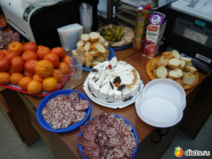 ... Причем девочка принесла мясо, которое папа сам запекал и рыбка красная мама солила... короче пахло все это просто грандиозно и с моим любимым хрустящем хлебом... ам... вот фото, только было 2 торта, че то я промахнулась и рыбку видно только кончик.