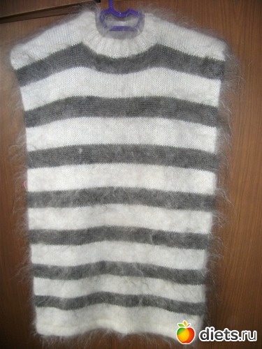 Женский жилет, достаточно пушистый (длинна ворса до 5 см), тонкий, мягкий, теплый. Длинна - 80 см, полуобхват 45 см. Можно носить как тунику. Связан из натурального козьего пуха.