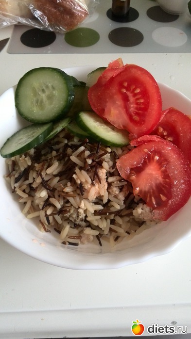 Обед- дикий рис с фаршем из куриной грудки, огурец, помидор, половинка апельсина.