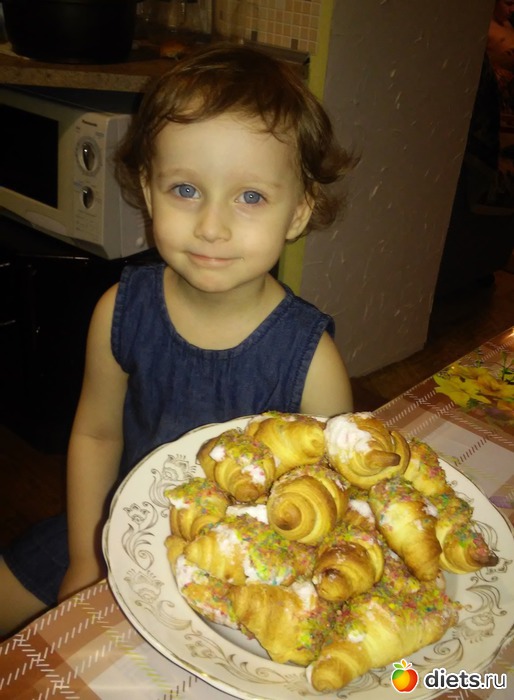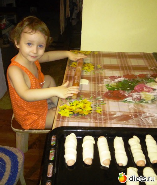 Ну в общем купила кило теста слоенного. Вчера пекли сосиски в тесте, ща покажу фото, доча помогает, моя зайка