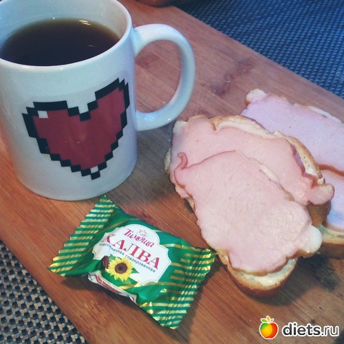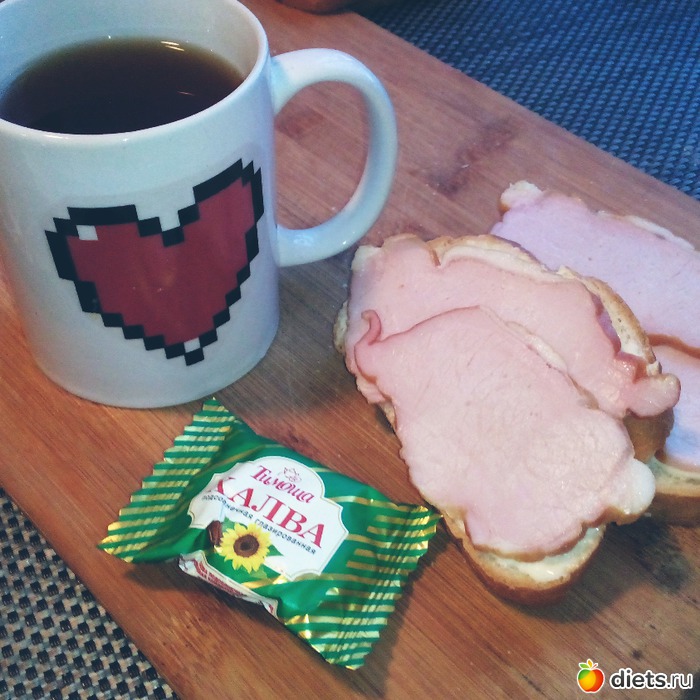 Завтрак: бутерброды с плавленым сыром и мясом, халвина, чай.