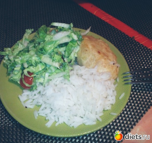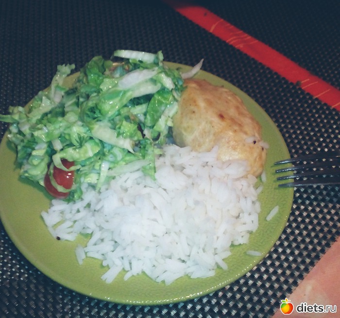 Обед: отварной рис, котлета из куриной грудки, запеченная в духовке, салат из пекинки, огурца, черри, укропа, заправленный йогуртом, зелёный чай.