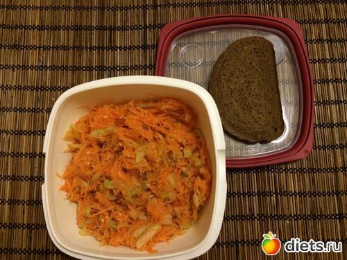 В 11.00 я покушала салат из моркови, сельдерея и огурца с кунжутом и семенами льна с кусочком заварного хлеба
