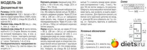 Двухцветный топ связан на спицах из 150 грамм белой и 50 грамм светло-серой пряжи двумя узорами. Верхняя часть - лицевой гладью, нижняя - ажурным узором по схеме.