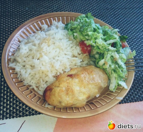 Обед: рис нешлифованный, котлета из грудки, салатик из пекинки, черри и огурца заправленный йогуртом, зелёный чай.