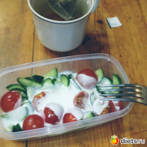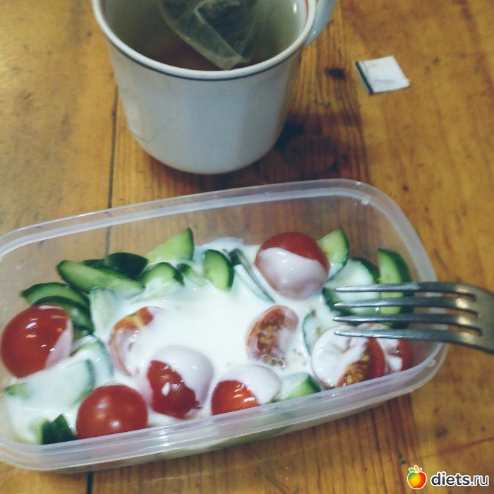 Ужин: огурец и черри с йогуртом, зелёный чай.