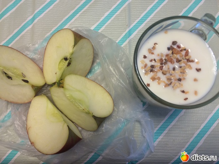 В 16.00 (где-то так) все было очень цивильно и правильно: яблоко и питьевой йогурт без добавок с орешками и сухофруктами