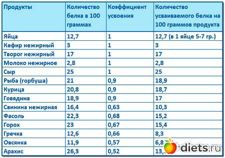 Сразу хочу обратить ваше внимание – не весь содержащийся в продуктах белок усваивается нашим организмом. Поэтому я сделала для вас удобную табличку, в которой вас в основном должна интересовать последняя колонка – КОЛИЧЕСТВО УСВАИВАЕМОГО БЕЛКА.