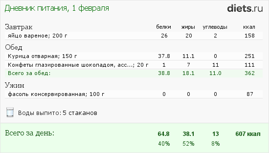 В обед съела куриную ногу и 2 конфетки с чаем, а на ужин 3 ложки консервированном фасоли