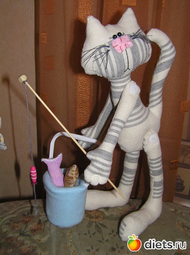 Кот-рыболов! Кот-рыболов сшит из хлопка, наполнитель-синтепон. Высота 30см. Самостоятельно сидит и стоит, с удовольствием составит компанию заядлым рыбакам. Принесет хороший улов. Удочка из бамбука. Ведерко из флиса с рыбками. С удовольствием порыбачит в любой местности.https://www.diets.ru/board/view/140413/