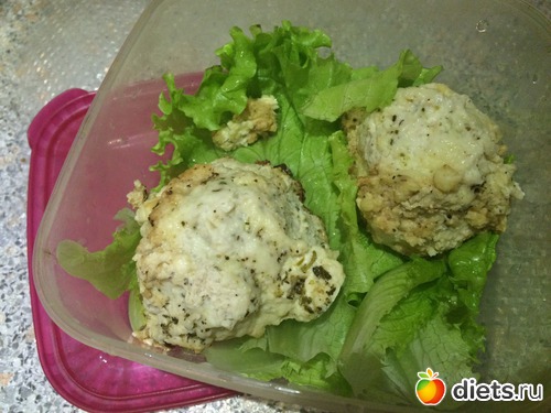 Потом свой ланч-обед - 2 куриных шарика в сливочно-сырном соусе с листьями салата