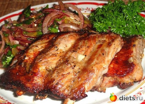 Продукты: 500 гр. нежирных свиных ребрышек; соль, черный перец, тмин; 3 зубчика чеснока, 300 мл. бульона или воды.