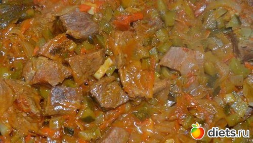 Приготовление: Обжарить на оливковом масле мясо и тушить в небольшом количестве жидкости на маленьком огне до полной мягкости ( около 1,5 часов). Выпарить жидкость. Долить немного масла положить нарезанный полукольцами лук, крупно натертую морковь, мелко порубленный чеснок и все обжарить, налить немного воды, прокипятить, добавить нарезанные кубиками огурцы, томатную пасту, соль, специи и зелень, при необходимости добавить воды, прокипятить.