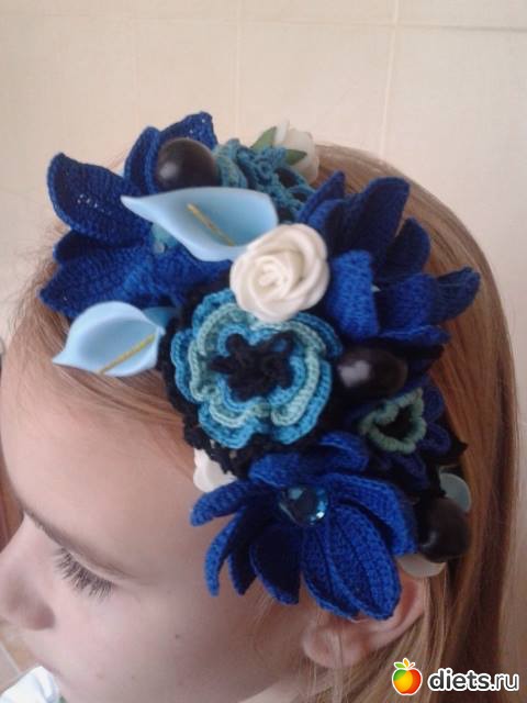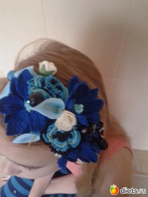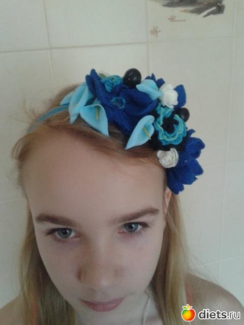 Это я по поводу обруча. Поскольку, я совершенно ничем не занята, то я вчера и сегодня состряпала к платью такую штуку. Только тсссс...что цветы синие не совсем такие по тону как на платье...вязать же нечем, а они скромно себе лежали еще с лета связанные, ну вот пришлось их... Из синего в доме были только голубые каллы и белые розочки, короче, если мне открыть магазин, то товар можно не подвозить еще пару недель...надеюсь рукодельницы меня поймут - все барахло это рукодельное хранится по всему дому. Вообще-то, он у меня первый, никогда обручи раньше не делала...