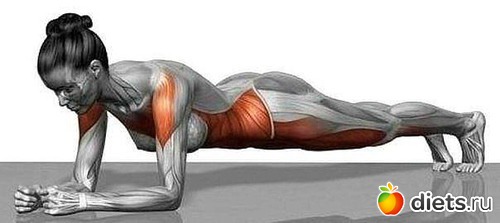 Это упражнение одновременно укрепляет мышцы пресса и спины, что обеспечит идеальную осанку. Старайтесь напрягать не только пресс и мышцы спины, но также и мышцы ног и ягодиц. Только так возможно сохранить прямую линию от плеч до пяток, что в свою очередь пывысит эффективность упражнения. Необходимо прочно удерживать положение, не расслабляясь ни на секунду. В позе Планки нужно оставаться в течение 1 минуты. В дальнейшем можно попыться поднимать одну ногу параллельно полу.