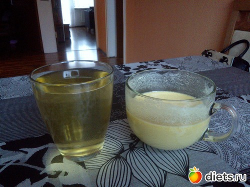 Справа как раз и находится разведенный порошок Almased. Вся проблема в том, что он не растворяется в воде и получается не однородный напиток, а как будто порошок отдельно, а вода отдельно. Пить это противно. А я себе еще и задачу усложнила, ела его ложкой, как суп. Вычитала этот способ в книге Марининой «Все не так». Вроде получилось. Я не только запивала почти каждую ложку зеленым чаем (не перепутайте его в стакане слева с мочой молодого осла