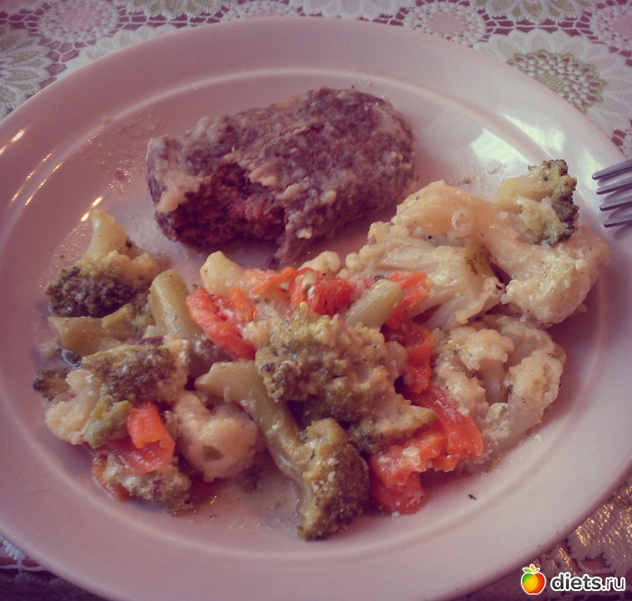 А ещё тут брокколя, цветная капуста и морква, тушёные в сметанке. Но это не всё. В процессе мамуля предложила мне квашкапусты и корейской моркови (боже, я обожаю всякие такие разносолы...), и я не смогла от них отказаться. В общем обед вышел на 503 кк.