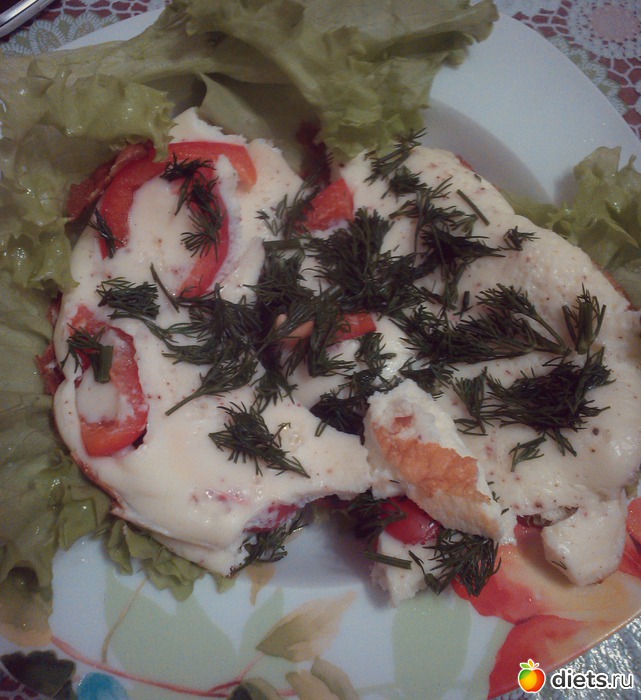 Омлет из двух яиц и молока, с болгарским перцем и укропом, жареный без масла, и салат Айсберг)