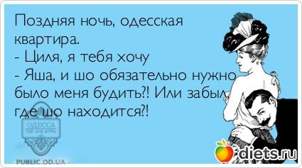 – Сара, послушайте, сколько вам лет? – Я недавно подошла к тридцати. – Ох, и шо ж вас так задержало в пути? * * * * * – Изя, вы играете на скрипке? – Нет. – А ваш брат, Беня? – Да. – Что, да? – Тоже нет. * * * * * – Изя, ешь кашу, шо б ты сдох, ты должен поправиться. * * * * * Одесса. На балкон выходит мама и кричит: – Аркаша! Домой...