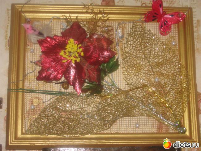 1. В рамку вставляем сетку крепим ее. С помощью клеевого пистолета крепим цветы, листья, веточки, птичек, бабочек. Картина готова. Читать полностью