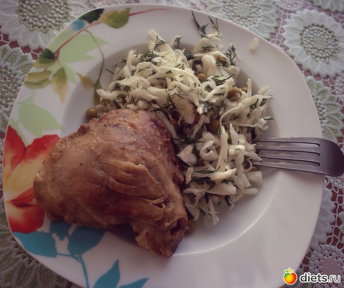 Мамуля накормила меня салатом из белокачанки, конс. горошка и укропчика, а также куриным бедром, запечёным в рукаве