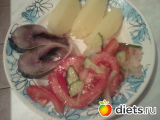 Обед: картошка отварная, селедка, салат с помидоров и огурцов.