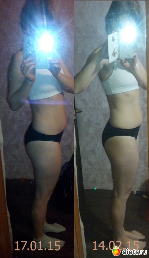 У меня почти совсем ушел животик. Но на бедрах еще много жира, даже при таком маленьком казалось бы весе.