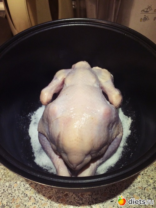 В общем, смысл этого действа в том, что в духовке создается соляная баня - это баня не дает жидкости из курицы выходить, при этом по соли курица берет только столько, сколько нужно ей самой - в зависимости от веса и т.д.