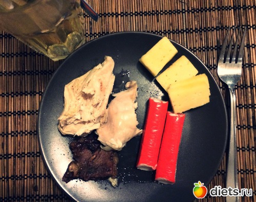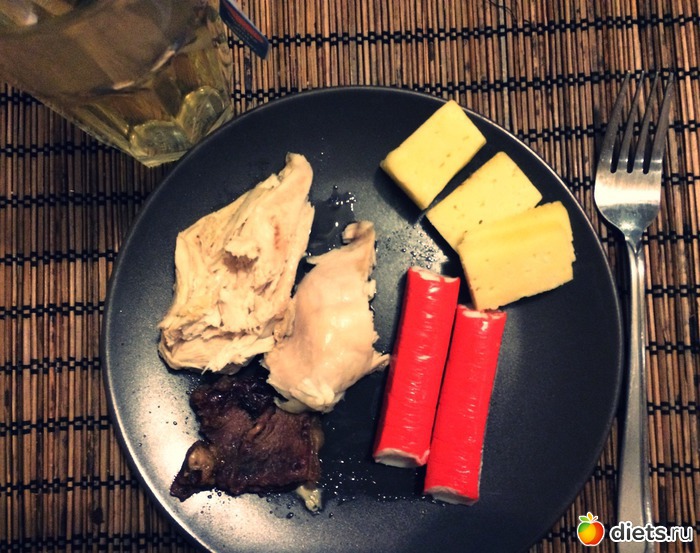 В 18.00 состоялся почти белковый ужин - кусочек курогрудки, маленький кусочек говядины на гриле, 2 крабпалки и 3 кусочка сыра