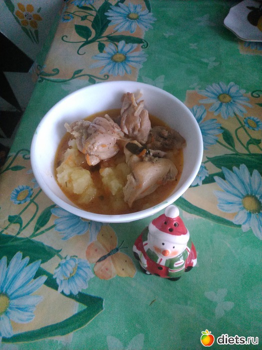 Обед - суп из говядины с ложкой сметаны, 3 ложки пюре и подлив с куриным мясом...