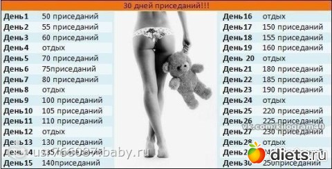 приседания, пресс, отжимания и т.п. И вот начинаешь ты заниматься первый день, сделал ты своих 50 приседаний - устала, ноги гудят, вспотела. Одним словом - молодец. И довольная собой обратно на диван.
