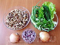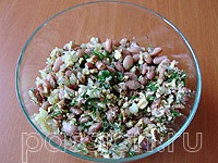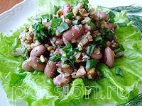 Грецкие орехи измельчить, добавить вместе с укропом к фасоли с луком, посолить, поперчить, перемешать.